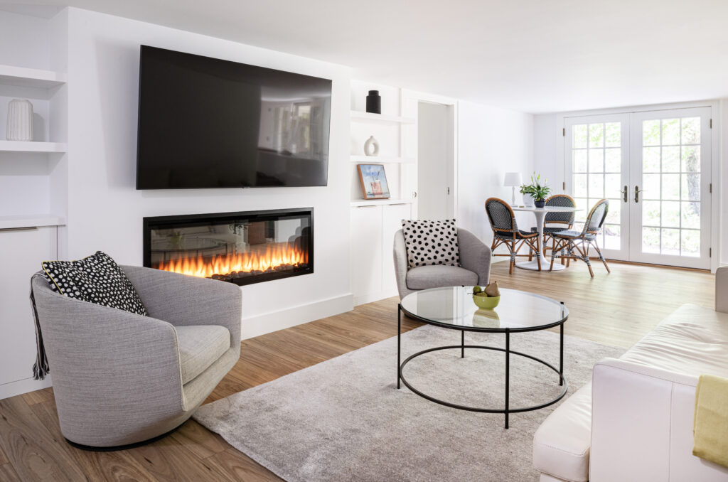Natural light transformed the equation entirely. French doors and full-height windows connect each room to the property’s wooded surroundings. What’s typically the darkest, most compromised level of a home became living space that doesn’t feel like a concession.